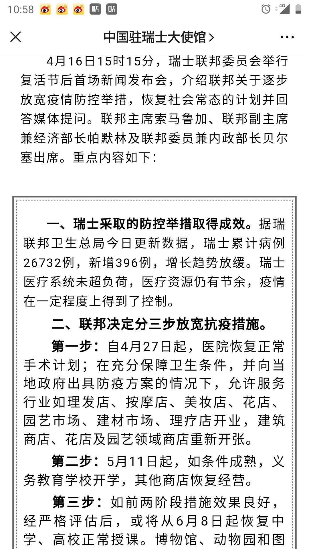 一、4月16日瑞士大使馆公布了一个消息,瑞士疫情过了拐点一段时间,将要逐步放宽管控政策。