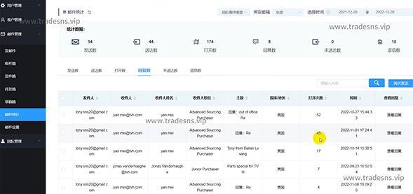 3、发送后——进入邮件统计界面,还可以进行客户的深度管理,可以很直观的了解到客户的联系情况,发了多少邮件,被打开了多少次,恢复情况等,将您的日常开发功能行为生成数字,通过数字的动态变化实现智能管理,线索管理。