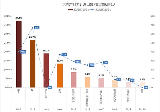 在过去的11个月里,中国大宗商品进口呈现出多元化的趋势。从数据中可以看出,铁矿砂、原油、煤、天然气和大豆等主要商品进口量均有所增加,而一些非必需品如初级形状的塑料和未锻轧铜及铜材的进口量则有所下降。